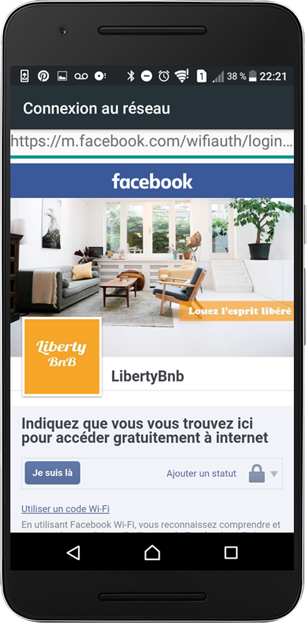 Ci-dessous un exemple de scénario d'un client qui se connecte à votre Wifi en utilisant son compte Facebook (+400% de "Je suis là").