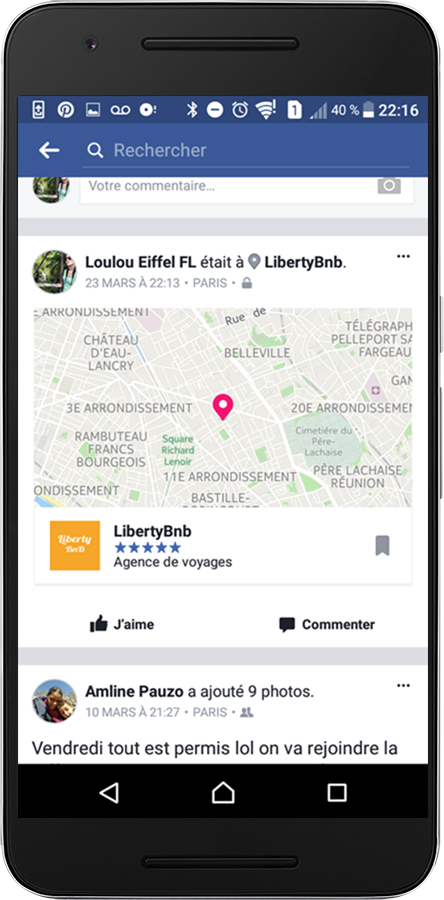 Ses amis Facebook voient maintenant la publication sur leur fil d'actualité. A savoir : Une page Facebook personnelle dénombre 100 amis en moyenne en France. Imaginez juste une dizaine de personnes/jour se connectant au WiFi : 30 000 personnes / mois auront vu automatiquement un message de leur ami à propos de votre établissement. Plus d'infos sur nos tarifs ici.