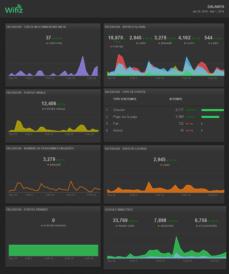 Depuis l'interface Wifiz vous pourrez accéder à tout moment et en direct au suivi des performances de vos pages Facebook & Instagram, et ainsi mesurer l'impact du Wi-Fi Marketing sur votre visibilité. Le tout sans aucun engagement de durée ! Plus d'infos sur nos tarifs ici. Pour plus d'infos sur le tableau ci-dessous, et les performances sur votre page Facebook,cliquez-ici.